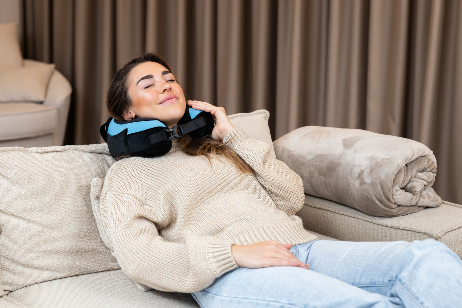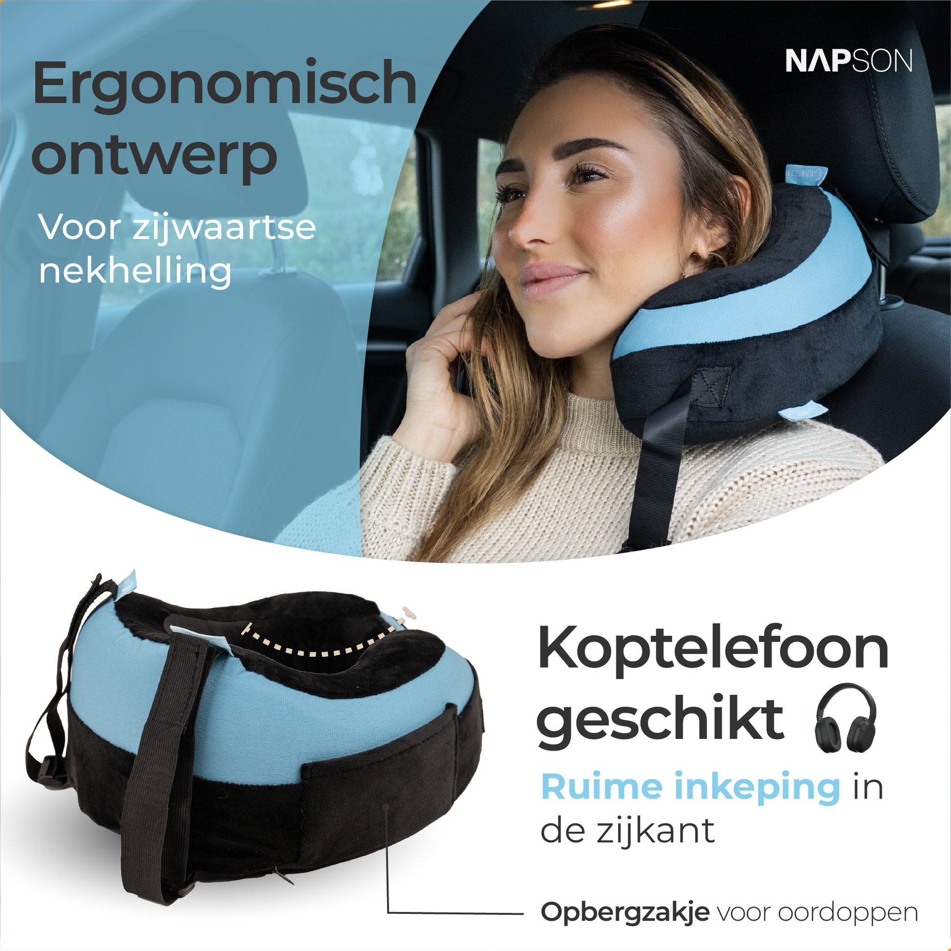 Tijdens het reizen bijvoorbeeld in de auto of in het vliegtuig. Heb je niet de juiste houding tijdens het slapen. Het nekkussen kan je doormiddel van de stoelbinders aan de stoel bevestigen waardoor je niet kan gaan knikken tijdens je slaap. Dit verminderd enorm veel nekklachten na het reizen.