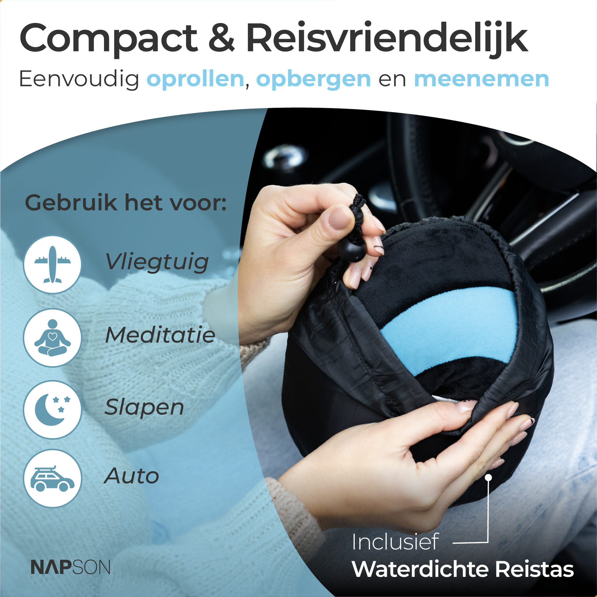 Rol het nekkusen gemakkelijk op en berg het op in het meegeleverde reiszakje. Sluit het goed en het is water afstotend.