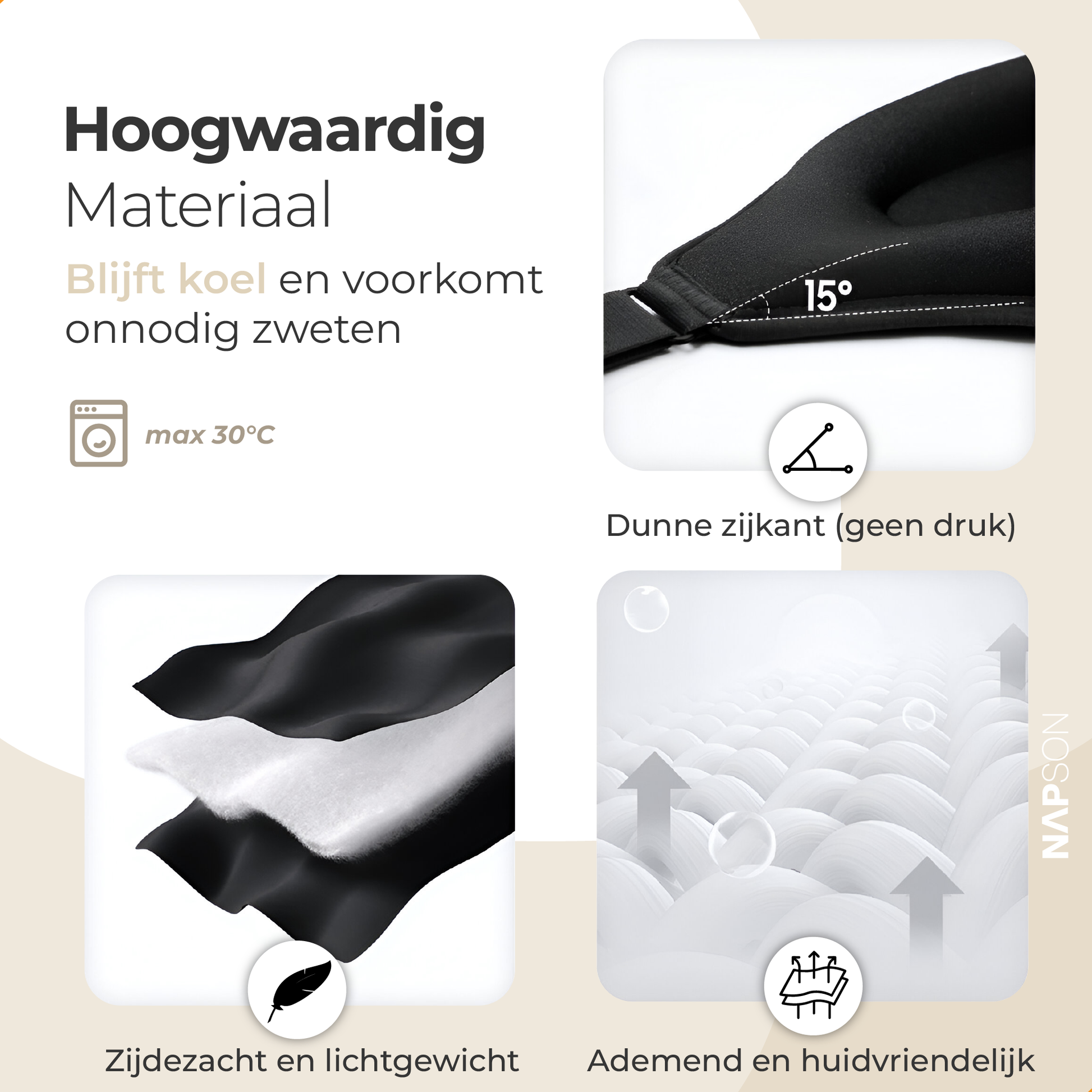 Het slaapmasker heeft een speciale zijkant met een subtiele hoek van 15°, waardoor het perfect aansluit op je gezicht – zelfs als je op je zij slaapt. Geen druk, geen knelling, geen dik masker dat in de weg zit. Alleen pure comfort, de hele nacht.